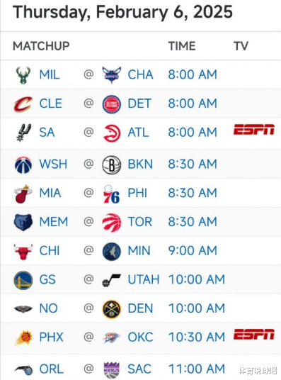 2月6日的太阳打雷霆的比赛时间,由北京时间上午9:00更改为10:30,并升级为ESPN全美直播,取代了鹈鹕vs掘金全美直播计划。